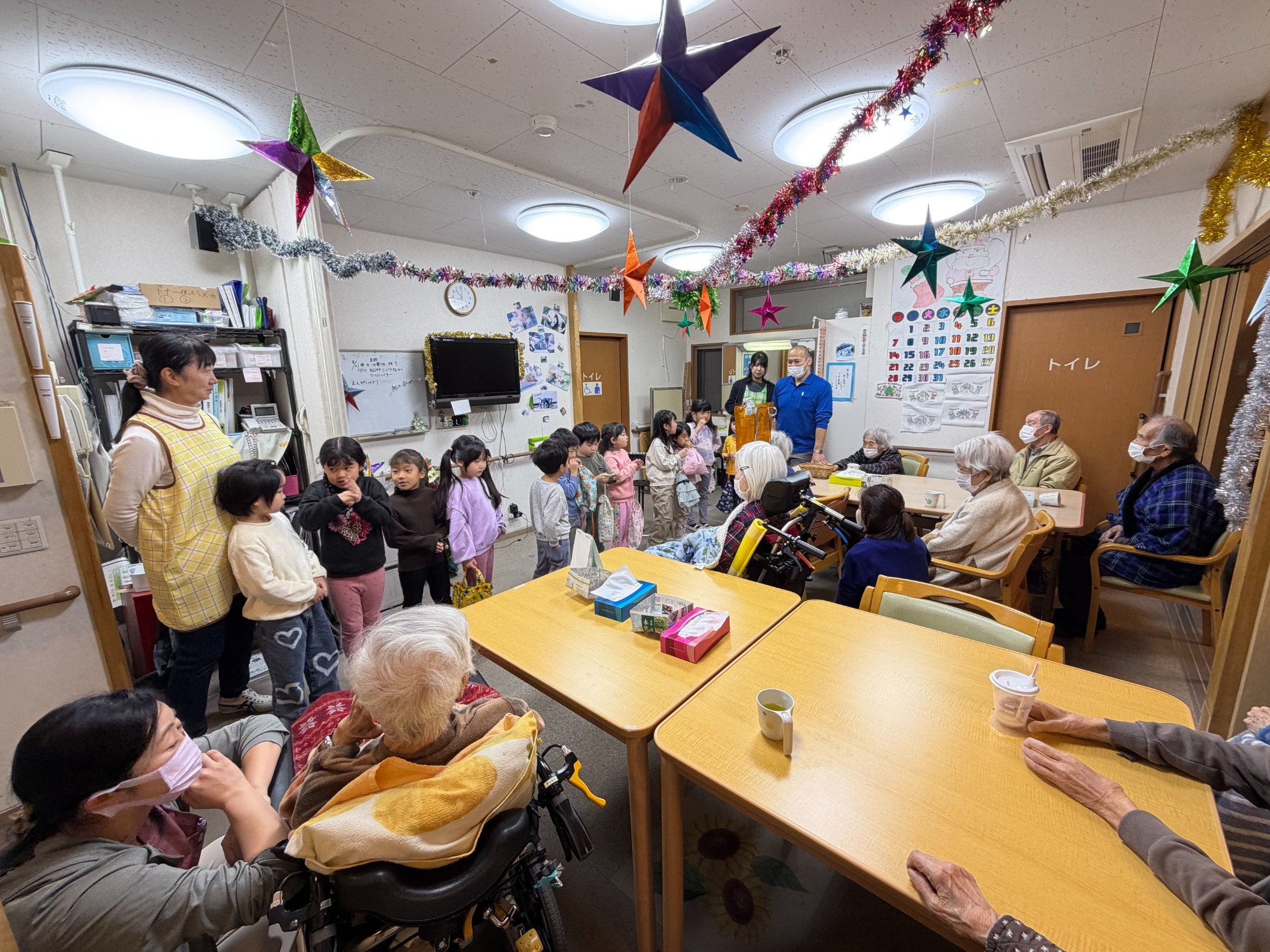 園児12名の大きな声での自己紹介と歌「ジングルベル」に、ご利用者も笑顔いっぱい。