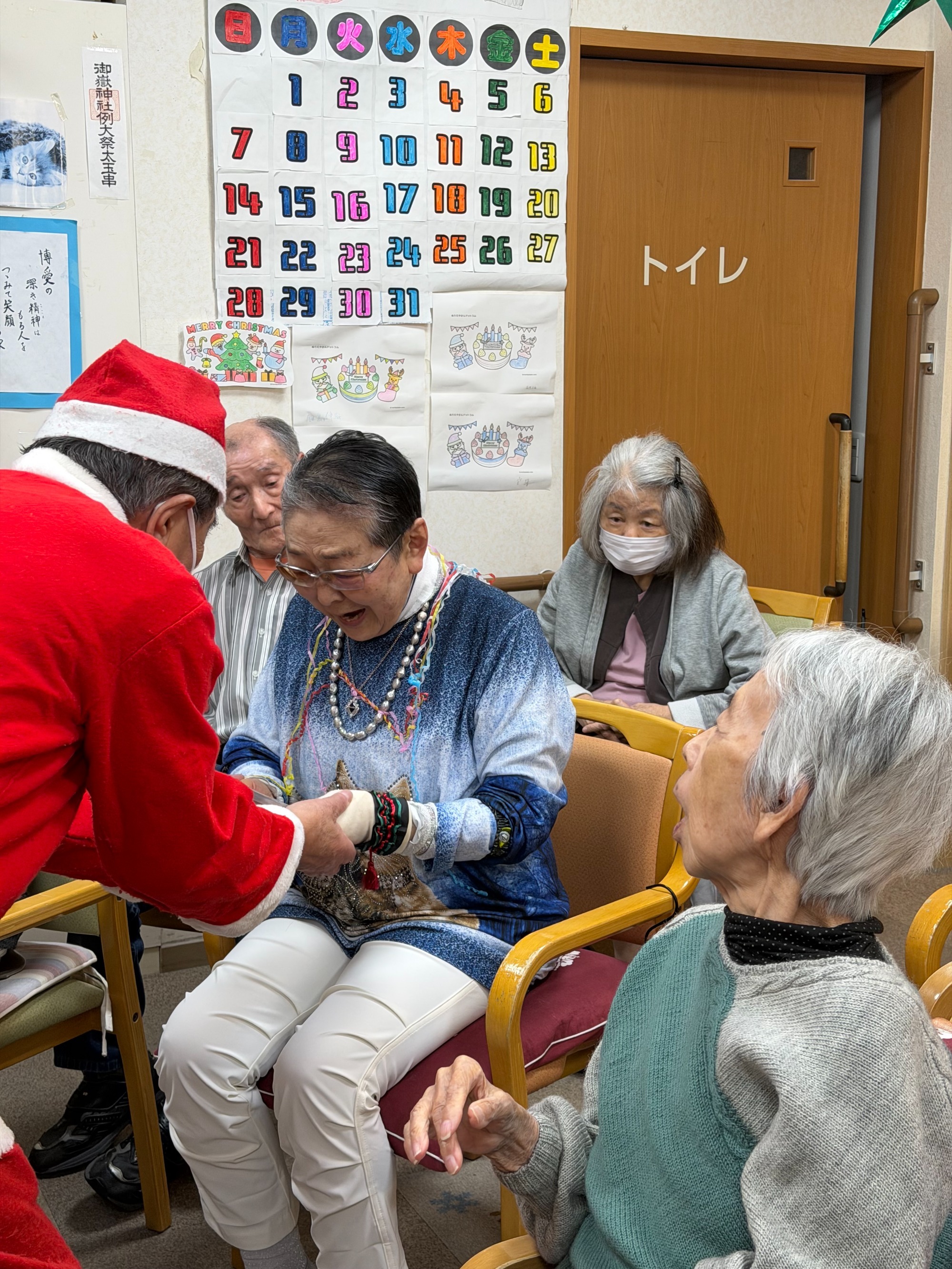 こまかい細工を頑張って作ってくださり、一人一人に手渡し。普段お孫さんや曾孫さんとの交流が少ないため、今日は皆さんとても楽しそうでした。
