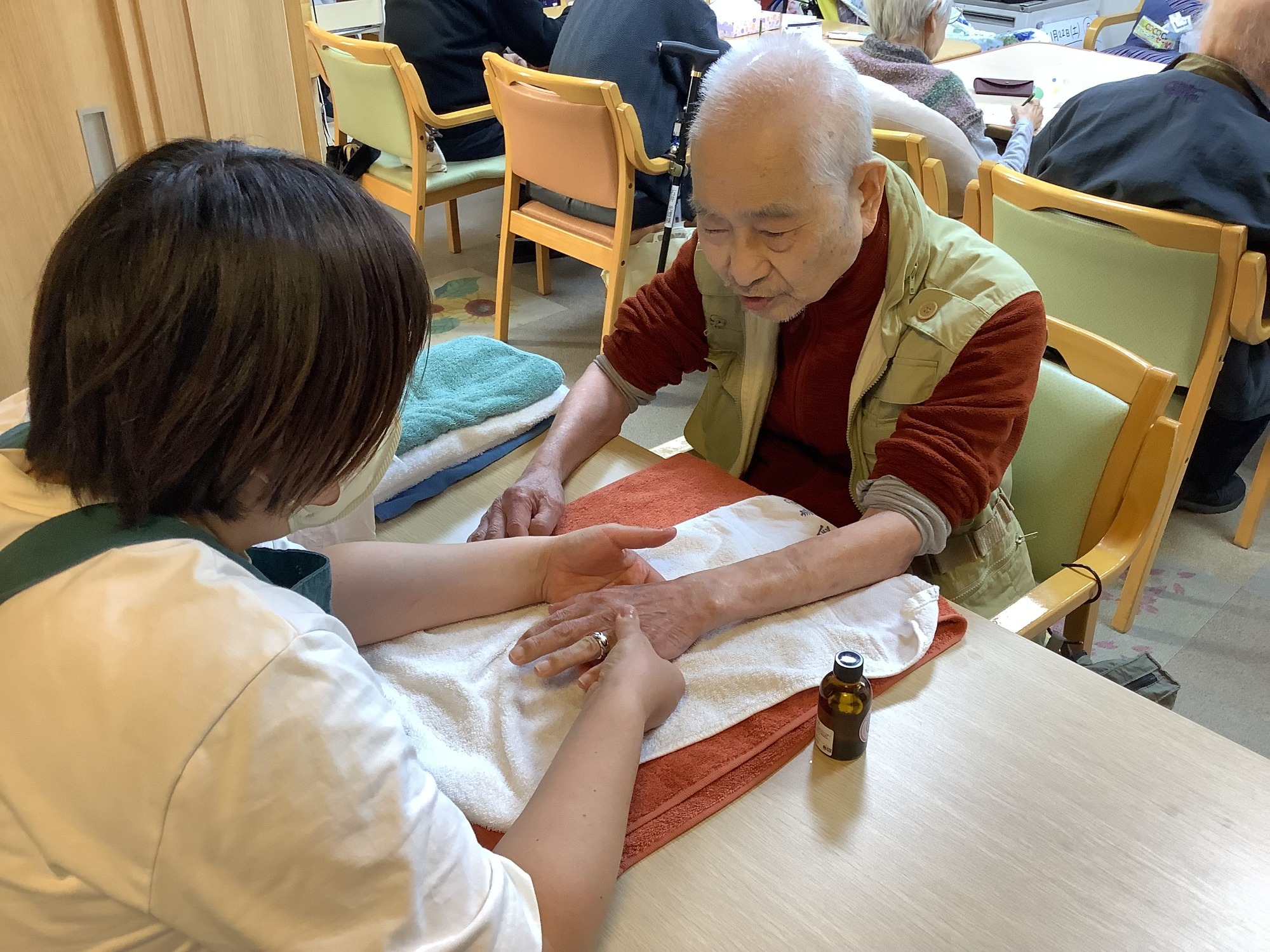 今日はリラックスタイム。ゆっくりとしたハンドマッサージに皆さん興味津々。